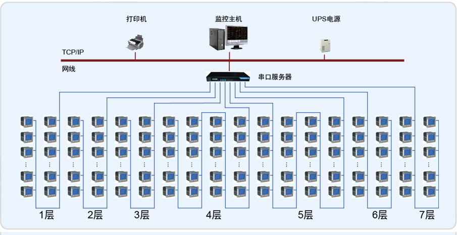 本項目電力監(jiān)控系統(tǒng)采用分布式結(jié)構,為現(xiàn)場層、通訊層和后臺監(jiān)控層。現(xiàn)場層指分布于于各樓層動力箱及地下配電室內(nèi)的安科瑞系列儀表,通訊層包括NPORT5630-16串口服務器、網(wǎng)絡交換機等,后臺監(jiān)控層包括計算機、打印 機、UPS電源等。通訊層及后臺監(jiān)控層都位于地下監(jiān)控室內(nèi)。現(xiàn)場所有安科瑞系列儀表通過屏蔽雙絞線拉到地下監(jiān)控室內(nèi),與串口服務器相連,經(jīng)交換機與計算機連接,實現(xiàn)數(shù)據(jù)采集。