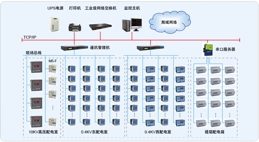 環智國際大廈配電系統主要包括:一個10KV高壓配電室、2個0.4KV低壓配電室和132個樓層配電箱。10KV配電間主要包括2路10KV進線柜、2個量電柜、2個避雷器柜、4個10/0.4KV變壓器饋線柜。10KV配電間總共使用了8臺M5-F微機保護裝置。0.4KV總進線部分選用ACR330ELH網絡電力儀表,0.4KV的饋線回路選用了ACR220ELF網絡電力儀表。電力監控系統需要通過T1-T4變壓器溫度控制箱的RS485接口采集變壓器繞組超溫報警信號、鐵芯超溫報警信號以及傳感器故障信號,并要具有聲音報警功能。需要采集直流柜的電池充放電狀態、電池組電壓、電池組電流、電池房溫度等信號,并通過直流屏信息表在界面上顯示出來。