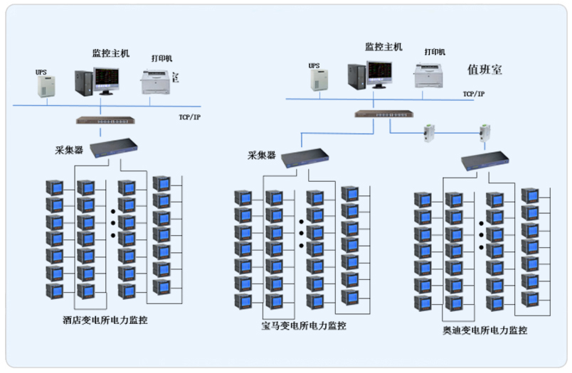 本項(xiàng)目根據(jù)管理區(qū)域設(shè)置兩套Acrel-2000型電力監(jiān)控系統(tǒng),系統(tǒng)采用網(wǎng)絡(luò)分布式結(jié)構(gòu),其中寶馬奧迪主機(jī)設(shè)置在地下配電值班室,酒店設(shè)置在一樓值班室。所有配電回路均配備安科瑞電力儀表PZ系列。該項(xiàng)目實(shí)現(xiàn)了3個(gè)變電所內(nèi)電力系統(tǒng)的智能管理。所有監(jiān)控設(shè)備均通過(guò)屏蔽雙絞線至各自配電室內(nèi)的通訊管理機(jī),從而實(shí)現(xiàn)遠(yuǎn)程監(jiān)控。