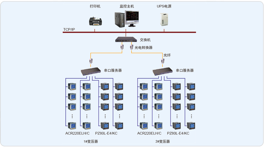 吳淞中心醫(yī)院電能管理系統(tǒng)監(jiān)控范圍變電所內智能儀表的運行參數(shù),吳淞中心醫(yī)院共一個變電所,變電所內有2路變壓器(1#變壓器、2#變壓器)出線及93路普通饋線。進線回路采用ACR220ELH多功能諧波儀表,普通饋線回路采用PZ96L-E4/C智能可編程電力儀表。整套電能管理系統(tǒng)站控管理部分包括監(jiān)控管理主機、打印機、UPS電源等;網絡通訊層部分包括一個16口的串口服務器;現(xiàn)場智能儀表監(jiān)控設備層由ACR220ELH和PZ96L-E4組成。該配電系統(tǒng)分布在一個變電所內,2臺變壓器的所有電力儀表通過RS485總線連接至串口服務器,并經過超五類網線上傳至監(jiān)控后臺。