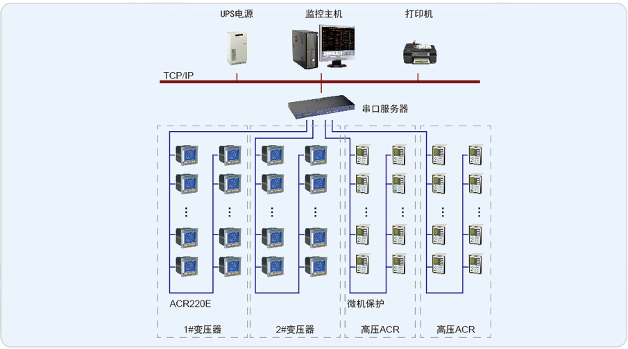 蘇州金閶中學(xué)共有一個變配電室,整個配電系統(tǒng)主要有2臺10/0.4 kV配電變壓器和2排高壓進線柜,共計62低壓4個10kV中壓進出線柜,實現(xiàn)了對整個學(xué)校的電力供應(yīng)。本項目電能管理系統(tǒng)主要對變電所內(nèi)62個進出線回路及10kV配電回路進行管理,實現(xiàn)電力參數(shù)實時遙測、電能計量、電能報表等功能。