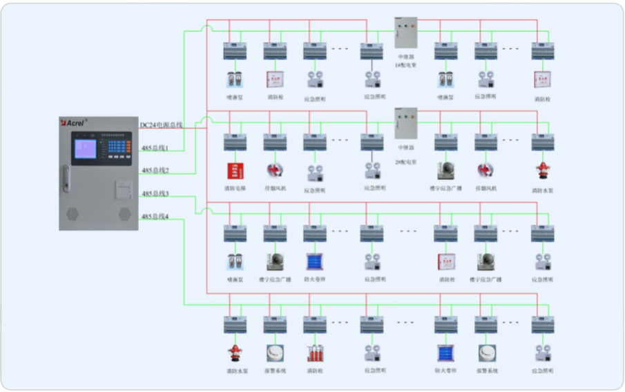 本期工程的監控范圍主要為真光廣學大樓及新建一號樓,新建一號樓47個漏電流監控裝置分布在B1~8F中,真光大樓33個漏電流監控裝置分布在B1F~9F中,現為本項目設計一套Acrel-6000電氣火災監控系統,監控裝置通過集線器及光纖至電氣火災監控裝置,并由此來實時監測商業樓內重要回路的漏電流,以確保商業區配電系統的電氣安全。