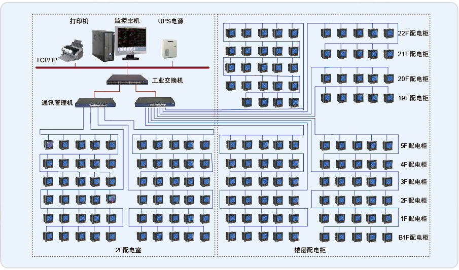 上海百樂門大酒店電力監(jiān)控系統(tǒng)監(jiān)控范圍為百樂門大酒店的22個樓層的PZ系列電力儀表和配電室的PZ、ACR系列電力儀表進行遠(yuǎn)程監(jiān)測。現(xiàn)場設(shè)備全集中在同一個配電室中,業(yè)主的電氣值班室就近安排在配電室旁,本系統(tǒng)監(jiān)控中心也安置在該值班室中。系統(tǒng)組網(wǎng)采用常見的3層結(jié)構(gòu),站控管理層、通訊管理層和現(xiàn)場設(shè)備層。