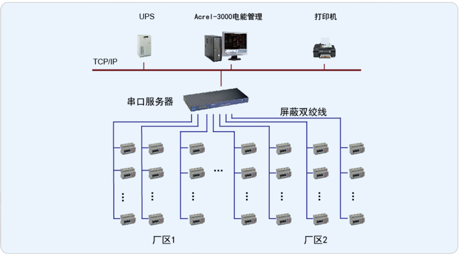 安科瑞電氣股份有限公司于2013年8月承接中國石油天然氣股份有限公司西南油氣田公司川西北氣礦江油輕烴廠電能管理系統(tǒng)的設(shè)計與實施,重要回路測量裝置分散安裝在整個廠區(qū)內(nèi),選用安科瑞DTSF1352/C三相電能表,采用屏蔽雙絞線直接接至數(shù)據(jù)采集器,然后通過網(wǎng)絡(luò)將數(shù)據(jù)傳至控制中心的監(jiān)控主機,保障了電能管理系統(tǒng)傳輸?shù)姆€(wěn)定性與實時性。系統(tǒng)實現(xiàn)了電力參數(shù)實時遙測、電能計量、電能報表等功能,做到集中管理、集中控制,省去了值班人員現(xiàn)場抄表的煩瑣,具有投資少、簡單實用、便于智能管理等優(yōu)點。