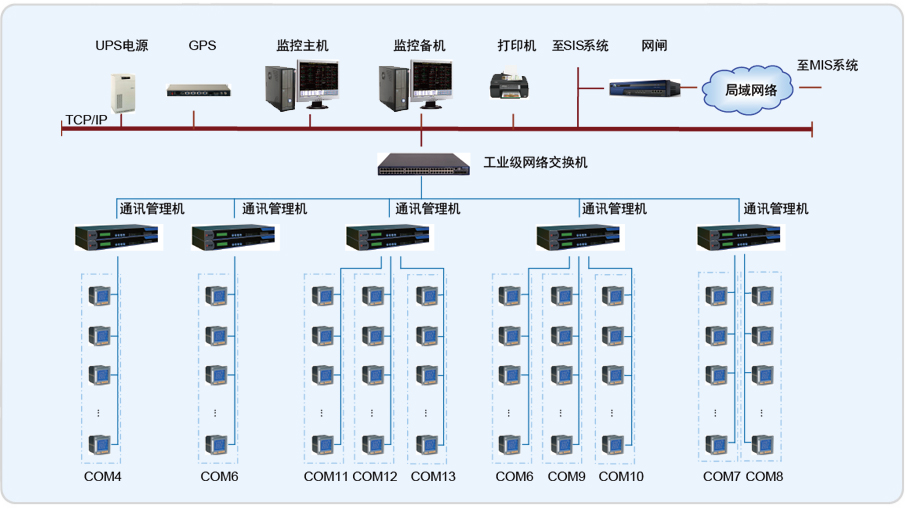 為了能實(shí)現(xiàn)對電廠電能量數(shù)據(jù)進(jìn)行自動采集、遠(yuǎn)傳和存儲、預(yù)處理、線損統(tǒng)計(jì)及分析的電能綜合管理平臺,合肥電廠電能量管理系統(tǒng)采用了Acrel-3000電能管理軟件,通過現(xiàn)場總線把現(xiàn)場的電能儀表進(jìn)行集中管理,做到了自動采集、集中控制、智能管理。同時本電能管理系統(tǒng)還具備同廠內(nèi)SIS(監(jiān)控信息系統(tǒng))以及MIS(管理信息系統(tǒng))共享。