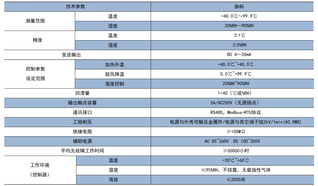 技術要求:濕度≧85%RH加熱除濕,≦80%停止;溫度≧40℃鼓風降溫,≦5℃加熱升溫。