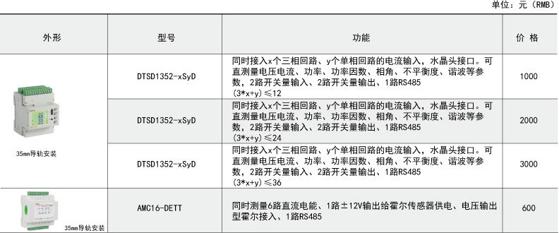 DTSD1352 - xSyD系列導軌式多回路電力儀表主要用于多個三相回路的全電參量測量,最多可同時接入x個三相回路、y個單相回路的電流輸入。可直接或間接測量電壓電流、功率、功率因數、相角、不平衡度、諧波等參數。