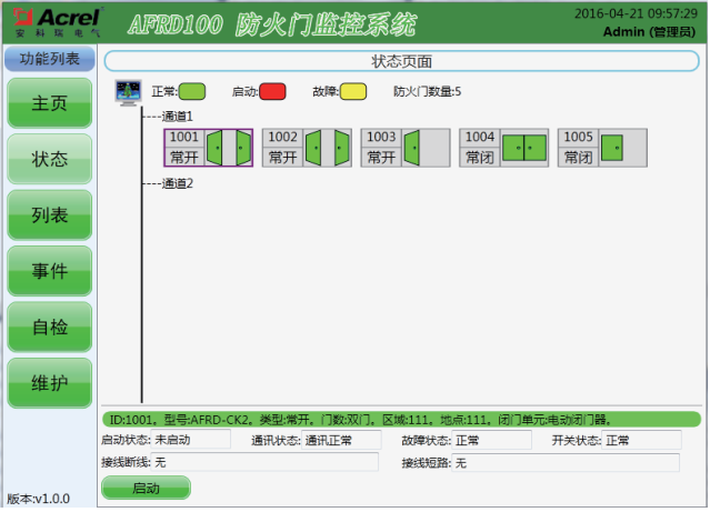 該界面以圖形化顯示方式直觀的展現(xiàn)了當前被監(jiān)測的防火門的工作狀態(tài),點擊防火門圖標后,系統(tǒng)會顯示該防火門的詳細信息。