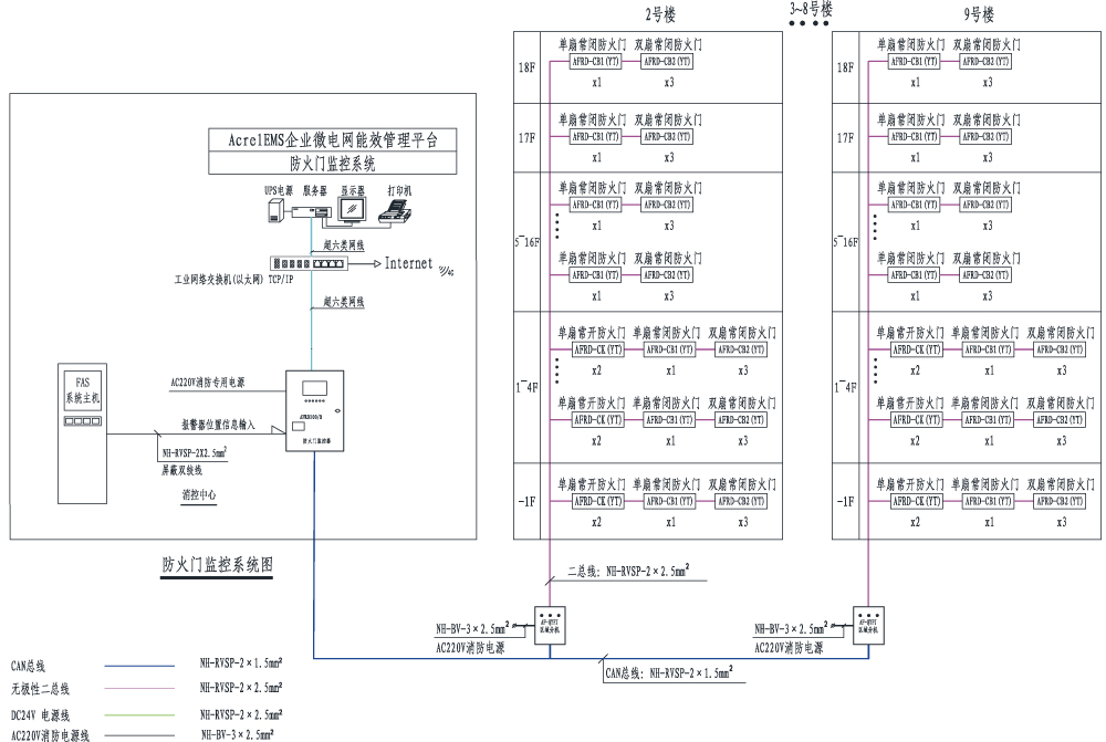 AFRD100防火門監(jiān)控系統(tǒng),是根據(jù)國家現(xiàn)行規(guī)范標準由安科瑞電氣股份有限公司研發(fā)的全數(shù)字化獨立運行的系統(tǒng),已通過國家消防電子產(chǎn)品質(zhì)量監(jiān)督檢驗中心的消防電子產(chǎn)品試驗認證,并且均通過嚴格的EMC電磁兼容試驗,保證了該系列產(chǎn)品在低壓配電系統(tǒng)中的安全正常運行,現(xiàn)均已批量生產(chǎn)并在全國得到廣泛地應用。該系統(tǒng)通過對電動閉門器、電磁釋放器、門磁開關等進行信號采集及控制,實現(xiàn)了防火隔離和防煙,并根據(jù)用戶的需求,還可以與AcrelEMS企業(yè)微電網(wǎng)管理云平臺或電氣火災自動報警系統(tǒng)等進行數(shù)據(jù)交換和共享。