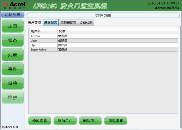 該界面設有三種操作級別,操作權(quán)限級別依次為“超級管理員”→“管理員”→“操作員”,其中高級別可添加低級別的新用戶。