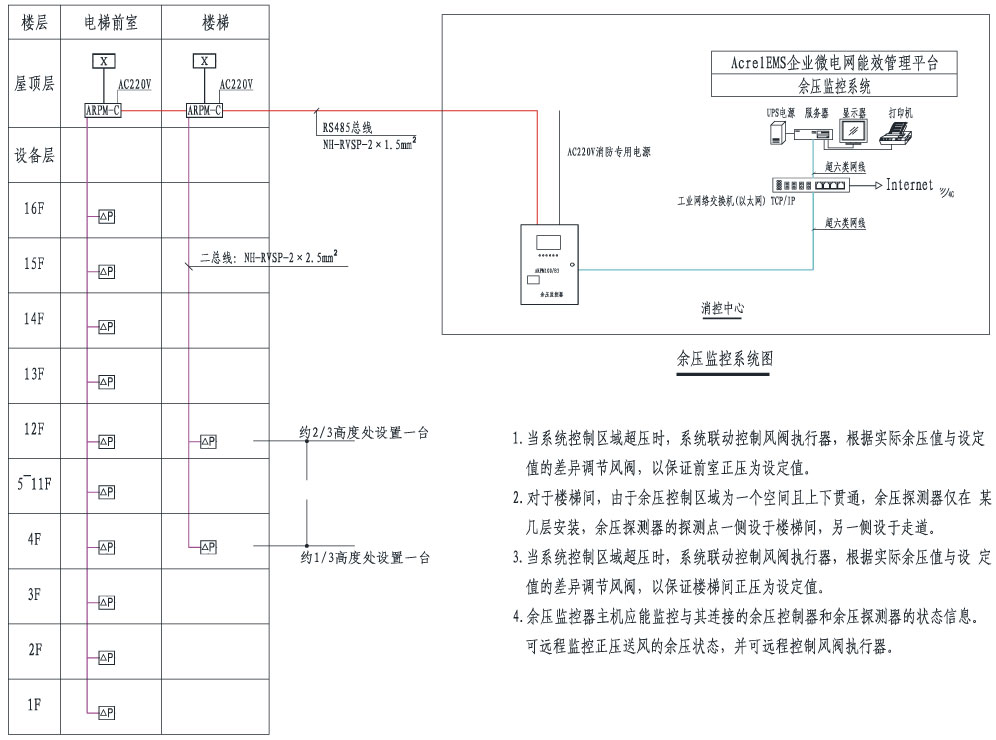 在建筑物內(nèi)公共區(qū)域走道、封閉樓梯間、防煙樓梯間及其前室、消防電梯及其前室或合用前室等處設(shè)置余壓探測(cè)器,用于檢測(cè)相應(yīng)區(qū)域兩側(cè)的壓力差值;加壓風(fēng)機(jī)處設(shè)置余壓控制器,當(dāng)加壓送風(fēng)機(jī)啟動(dòng)后,控制器根據(jù)余壓探測(cè)器超壓/加壓動(dòng)作指令,控制泄壓閥動(dòng)作,確保上述區(qū)域的壓差值滿(mǎn)足規(guī)范要求;泄壓閥處安裝風(fēng)閥執(zhí)行器,用于將余壓控制器輸出的控制信號(hào)轉(zhuǎn)換為執(zhí)行動(dòng)作,控制泄壓的開(kāi)關(guān),實(shí)現(xiàn)加壓送風(fēng)系統(tǒng)的風(fēng)量隨系統(tǒng)調(diào)節(jié),余壓監(jiān)控器安裝在安防消防控制室。根據(jù)用戶(hù)的需求,余壓監(jiān)控系統(tǒng)可以滿(mǎn)足與AcrelEMS企業(yè)微電網(wǎng)管理云平臺(tái)或電氣火災(zāi)自動(dòng)報(bào)警系統(tǒng)等進(jìn)行數(shù)據(jù)交換和共享。