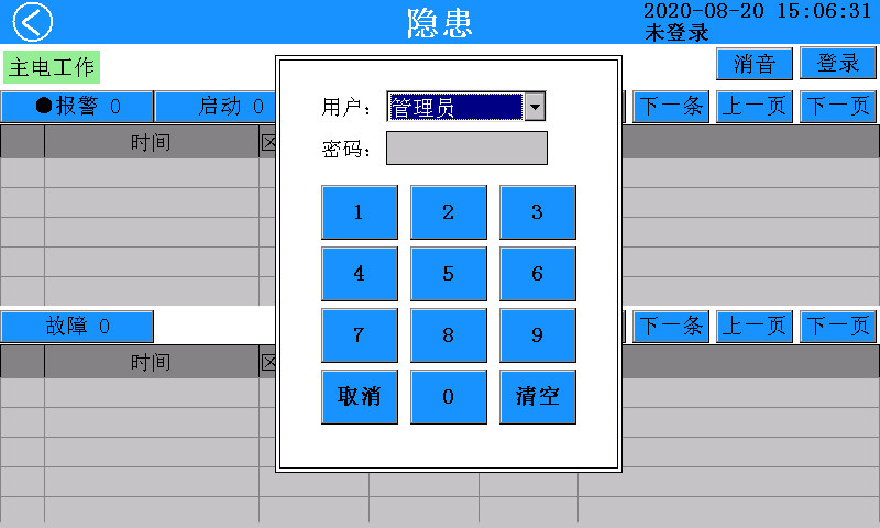 余壓監(jiān)控器上電后,監(jiān)控軟件自動(dòng)運(yùn)行,顯示屏顯示程序未登錄狀態(tài)下的主頁(yè)面,此時(shí)軟件已經(jīng)準(zhǔn)備就緒,等待用戶(hù)登錄