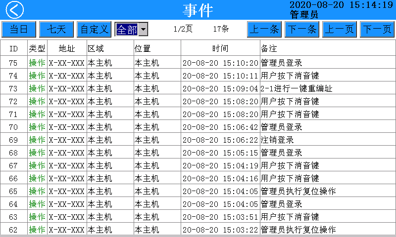 在該頁(yè)面內(nèi)可查詢(xún)?nèi)我鈺r(shí)段內(nèi)的報(bào)警、故障、事件記錄。點(diǎn)擊“當(dāng)日”按鈕查詢(xún)當(dāng)日所有記錄,點(diǎn)擊“最近7天”按鈕查詢(xún)最近7天所有記錄。點(diǎn)擊“自定義”按鈕可以選擇時(shí)間范圍內(nèi)再進(jìn)行查詢(xún)