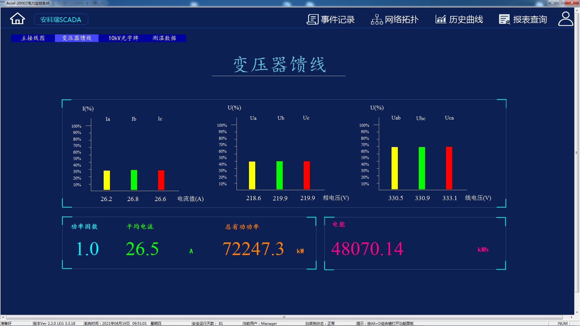 Acrel-1000綜合自動化監(jiān)控系統(tǒng)在配電一次圖中,可以直接查看該回路詳細電參量,界面也可用棒圖的形式更直觀的展示三相電流、三相電壓、有功功率、無功功率、功率因數、電能等。